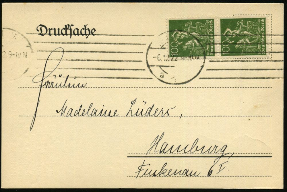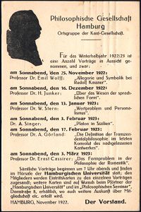 | 1094 | 18 € | WEIMARER REPUBLIK 1919 - 1932/33 : Hamburg 1922 (6.12.) Einladungskt. "Philosophische Ges. Hambg." ,u.a. Vortrag über K a n t (Abb. Kant-Scherenschnitt-Büste) "Die Definition d.Tranzendentalphilosophie..", Infla-Orts-Drs.-Karte (Mi.187 MeF) | | |