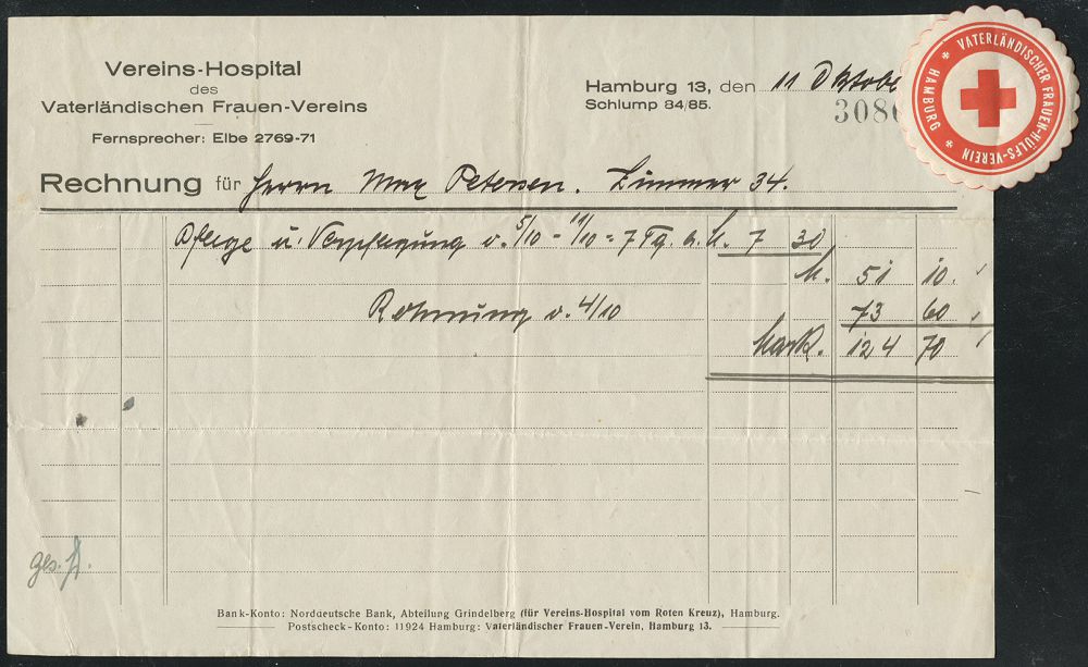 | 1103 | 16 € | WEIMARER REPUBLIK 1919 - 1932/33 : Hamburg 1930 (11.10.) Rotkreuz-Siegeloblate: VATERLÄNDISCHER FRAUEN-HÜLFS-VEREIN HAMBURG auf Rechnung des DRK Vereins-Hospitals für Pflege und Verpflegung (gefaltet) Format 22,8 x 14,8 cm | | |