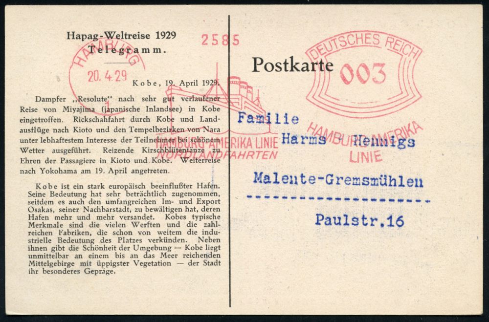 | 1102 | 25 € | WEIMARER REPUBLIK 1919 - 1932/33 : HAMBURG/ 1/ ..NORDLANDFAHRTEN/ HAMBURG AMERIKA/ LINIE 1929 (20.4.) seltener AFS Francotyp "Bogenrechteck" (Fahrgastschiff) Reederei-Telegramm-Ak.: Hapag-Weltreise 1929, Kobe..Japan (traditionell gekleidete Frauen füttern Kleinkind) Bedarf (Dü.E-1BAh) | | |