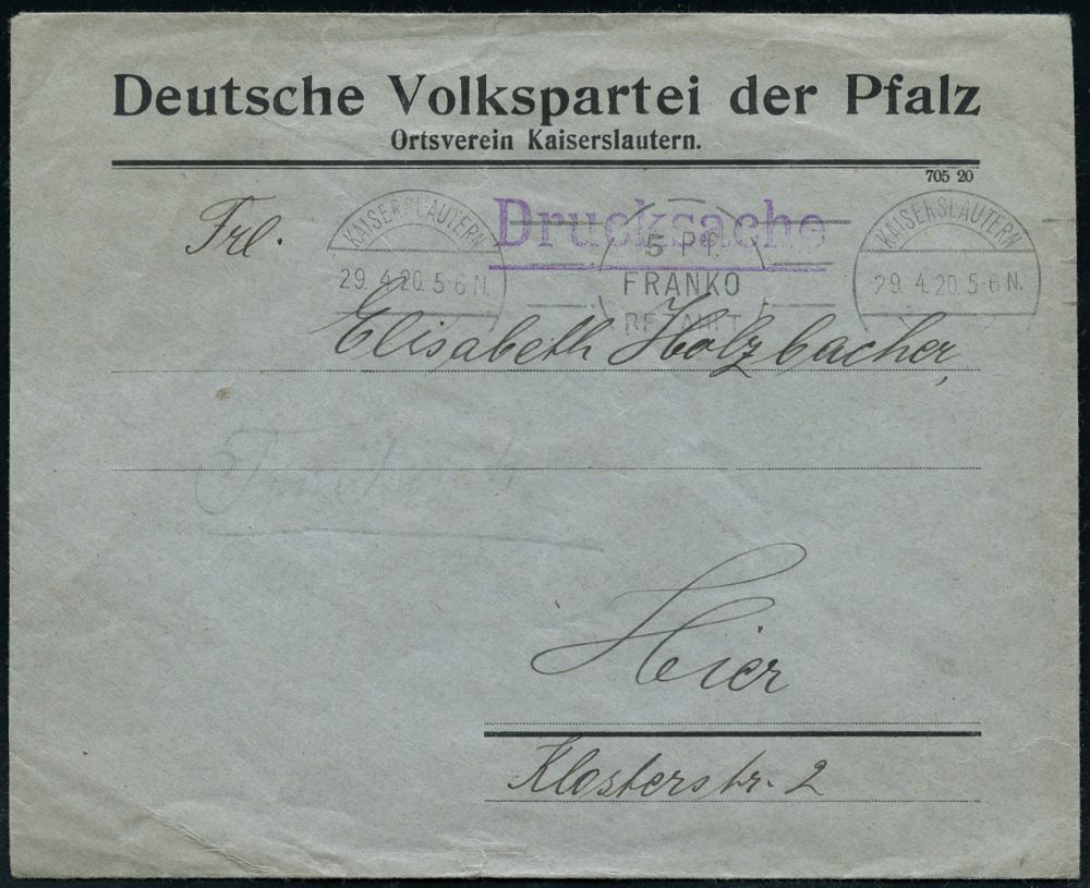 | 1105 | 25 € | WEIMARER REPUBLIK 1919 - 1932/33 : KAISERSLAUTERN/ *1*/ FRANKO/ BEZAHLT 1920 (29.4.) schwarzer Band-PFS 5 Pf., Typ Sylbe (Ziffer u. Sterne nicht sichtbar) , seltener Vordruck-Bf.: Deutsche Volkspartei der Pfalz = Zeitgeschichte! (Dü.C-1, Nr.2 c, nur in Bayern) | | |