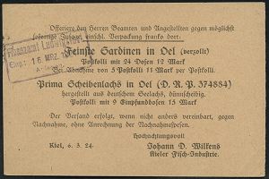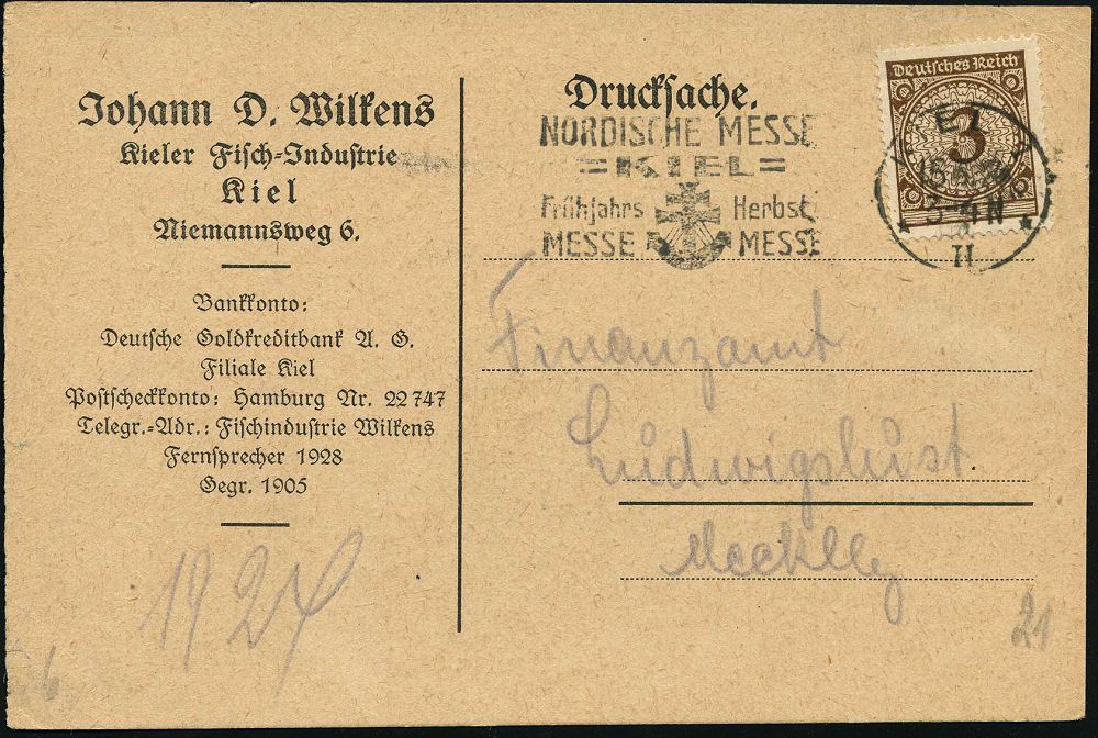 | 1106 | 18 € | WEIMARER REPUBLIK 1919 - 1932/33 : KIEL 1/ *II*/ NORDISCHE MESSE/ KIEL.. 1924 (15.3.) seltener MWSt (stilis. Hanse-Kogge) klar gest. Firmen-Kt.: Joh. Wilkens, Kieler Fisch-Industrie mit Sardinen- u. Lachs-Angebot (Bo.21 A III) | | |