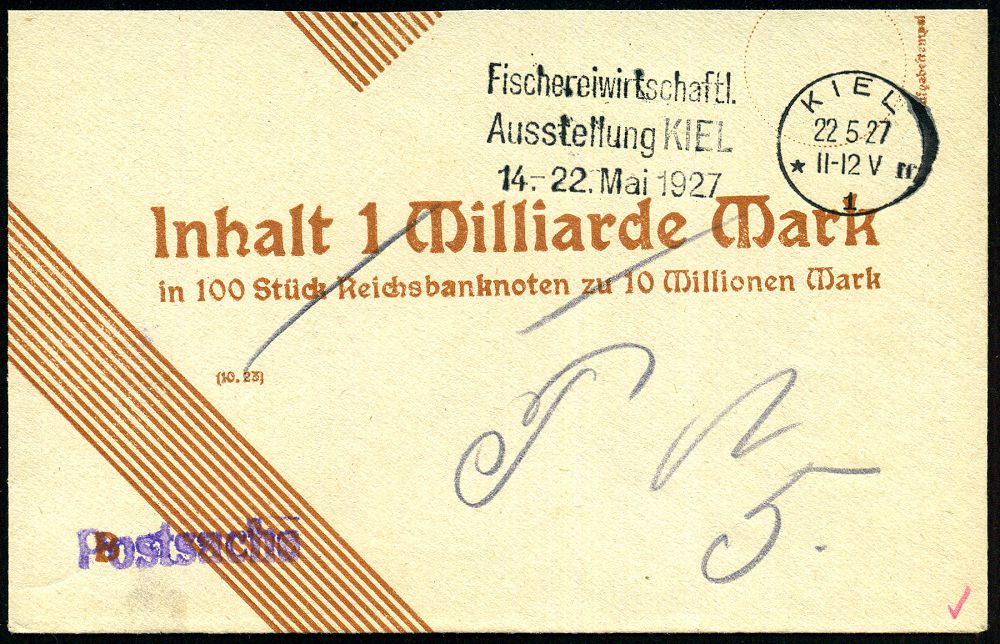 | 1107 | 22 € | WEIMARER REPUBLIK 1919 - 1932/33 : KIEL/ *1ff/ Fischereiwirtschaftl./ Ausstellung KIEL/ 14.-22.Mai 1927 (22.5.) seltener MWSt + 1L: Postsache klar altem Infla-Dienst-Notumschlag: Inhalt 1 Milliarde Mark.. (rs. Klappe fehlt) an P.A. 5 (Bo.23 A) | | |