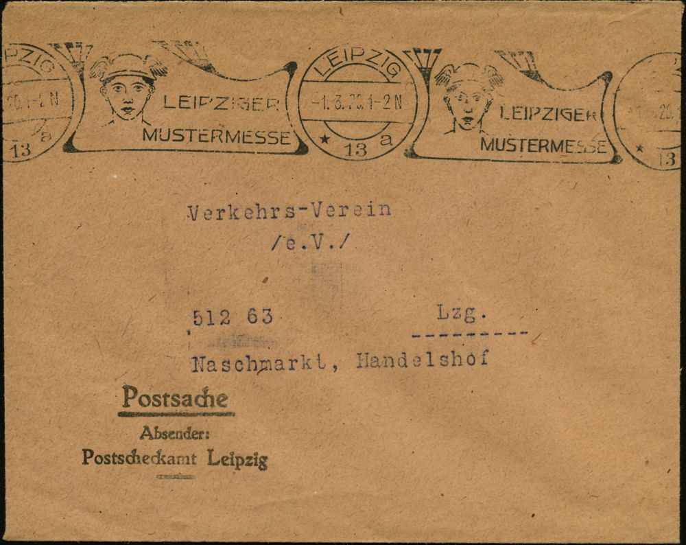 | 1108 | 25 € | WEIMARER REPUBLIK 1919 - 1932/33 : LEIPZIG/ *13a/ LEIPZIGER/ MUSTERMESSE 1920 (1.3.) Band-MWSt mit Merkurkopf klar auf Psch-Dienstbf.: PSch-Amt Leipzig an den (Messe)-Handelshof!, selten! (Bo.36 Bd II, nur 3 Wochen verwendet!) | | |