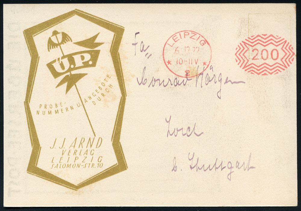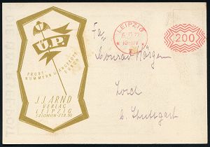 | 1113 | 25 € | WEIMARER REPUBLIK 1919 - 1932/33 : LEIPZIG/ *2* 1922 (6.12.) Infla-PFS "Ziermuster" 200 (Pf.) auf Künstler-Color-Reklame-Ak.: J. J. ARND VERLAG.. DIE ÜBERSEE-Post (Leser von Segelschiffen) n. Lorch (Dü.D-1, Nr18) | | |