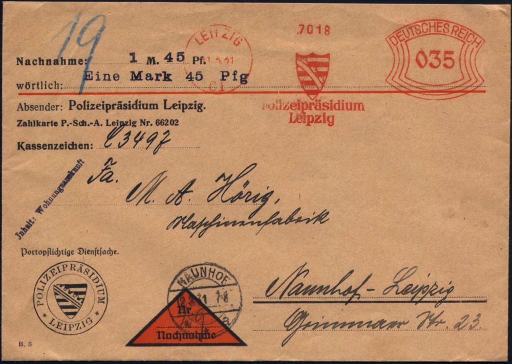 | 1118 | 20 € | WEIMARER REPUBLIK 1919 - 1932/33 : LEIPZIG/ C1/ Polizeipräsidium 1931 (11.3.) AFS Francotyp "Bogenrechteck" 035 Pf. (Wappen) auf NN-Dienst-Bf.: Polizeipräsidium Leipzig.., Inl.-NN-Bf. n. Naunhof (vs. AS), seltenes Porto! (Dü.E-1BAh) | | |