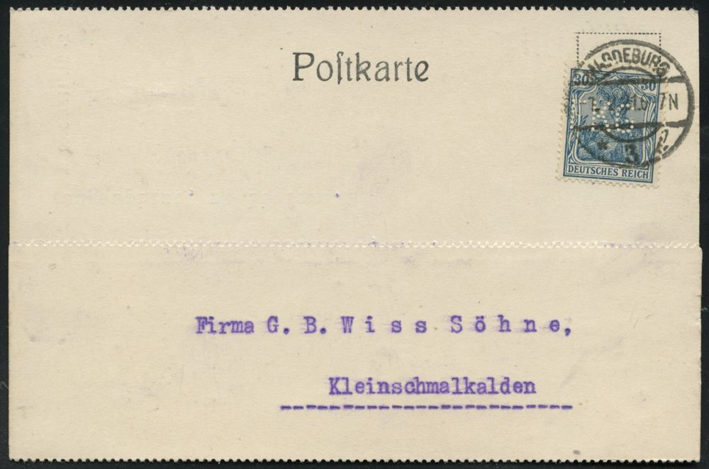 | 1125 | 16 € | WEIMARER REPUBLIK 1919 - 1932/33 : MAGDEBURG/ * 3 l 1921 (1.2.) 1K-Brücke auf EF 30 Pf. Germania, blau mit Firmenlochung: "F K G" = F riedr. Krupp-Gruson auf Nachkriegs- Firmenkt., starke Reduzierung der Waffen-Produktion! (Versailler Vertrag!), rs. viol. Abs.-3L, Krupp-Gruson = Technik- u. Waffen-Pioniere! (Mi.144 EF Perfin) | | |