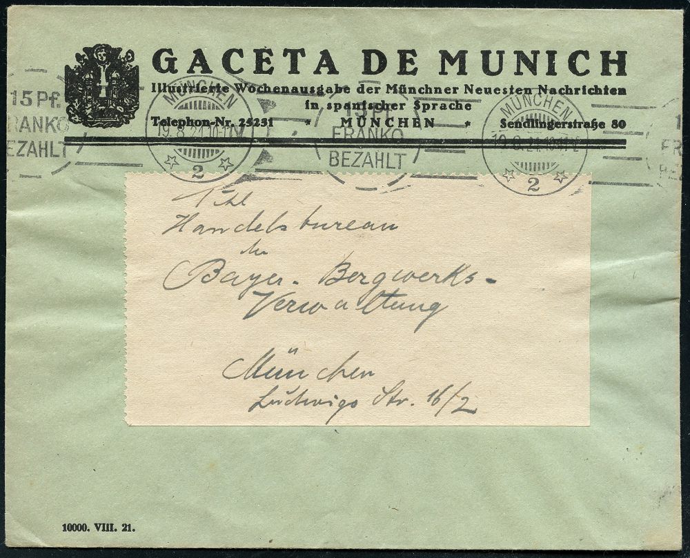 | 1128 | 20 € | WEIMARER REPUBLIK 1919 - 1932/33 : MÜNCHEN/ *2*/ FRANKO/ BEZAHLT 1921 (19.8.) schwarzer Band-PFS 15 Pf., Typ Sylbe auf Vordruck-Bf.: GACETA DE MUNICH, Illustrierte Wochenausgabe.. in spanischer Sprache, Orts-Bf. (Dü.C-1, Nr.5 c) | | |
