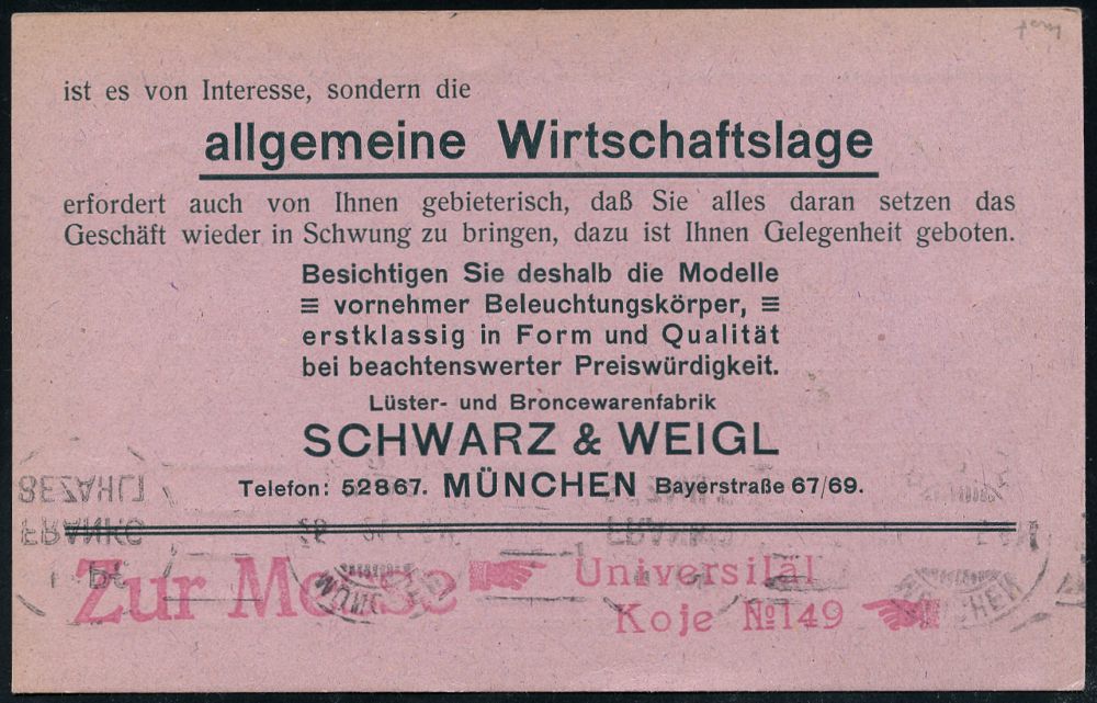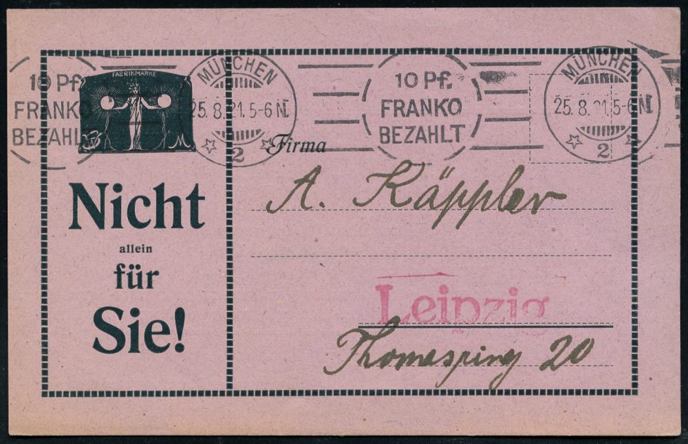 | 1129 | 18 € | WEIMARER REPUBLIK 1919 - 1932/33 : MÜNCHEN/ *2*/ FRANKO/ BEZAHLT 1921 (25.3.) schwarzer Band-PFS 10 Pf., Typ Sylbe auf Reklame-Kt.: SCHWARZ & WEIGL..Broncewarenfabrik + roter Leipz- Messe-HdN (Dü.C-1, Nr.4 c) | | |