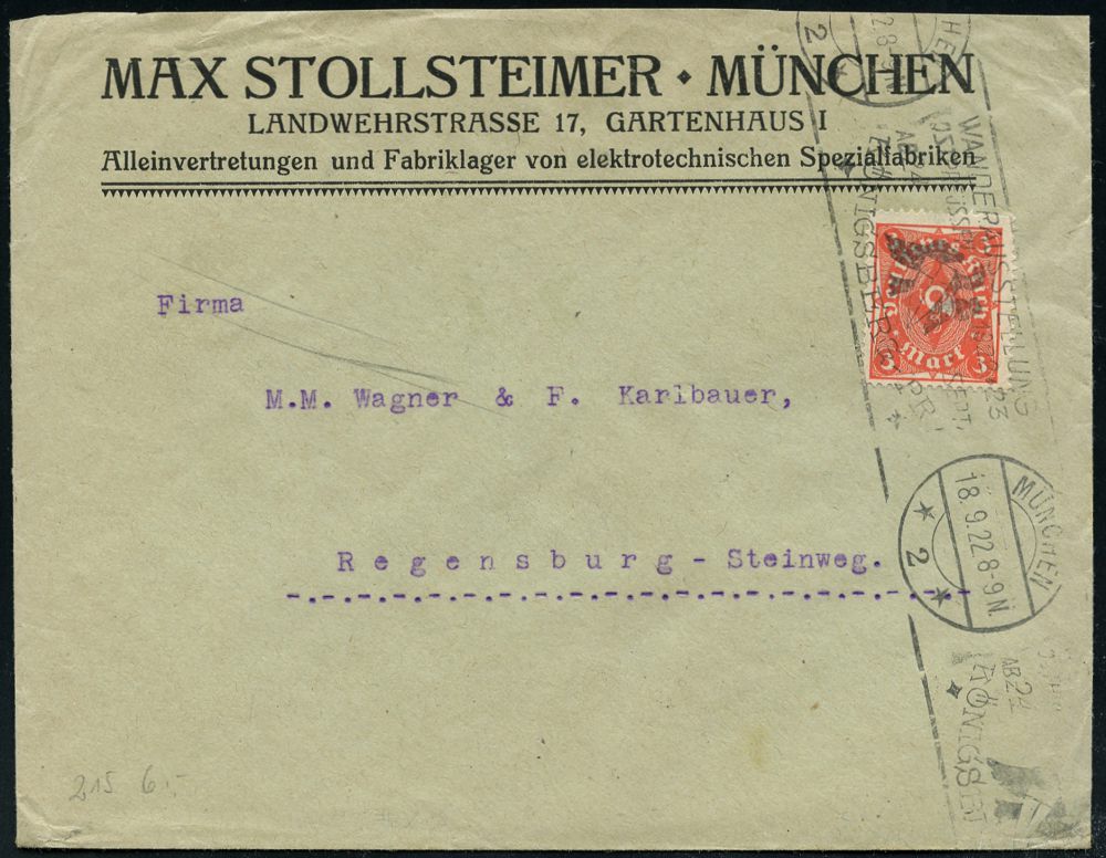 | 1132 | 40 € | WEIMARER REPUBLIK 1919 - 1932/33 : MÜNCHEN/ *2*/ WANDERAUSSTELLUNG/ OSTPREUSSEN 1922-23/ AB 24.SEPT./ KÖNIGSBERG-PR 1922 (18.9.) seltener Band-MaWSt = Adler mit Kreuzritterschild auf EF 3 Mk. Posthorn , Firmen-Bf.: MAX STOLLSTEIMER.. elektrotechn. Spezialfabriken n. Regensburg (Bo26 Bd II, n u r in München verwendet!) | | |
