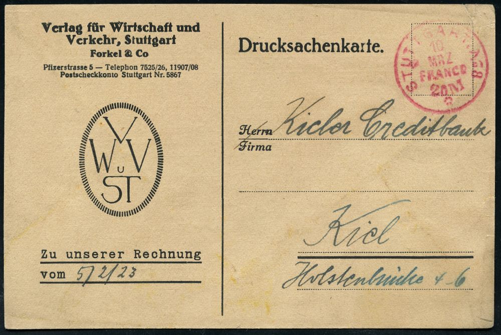 | 1143 | 25 € | WEIMARER REPUBLIK 1919 - 1932/33 : STUTTGART No 8/ FRANCO 20 M 1923 (10.3.) 1K-PFS 20 M(ark) auf Infla-Firmen-Drs.-Kt.: Verlag für Wirtschaft u. Verkehr.. (Mahnung) n. Kiel (Dü.A-3, Nr.8, 20 Mark) | | |