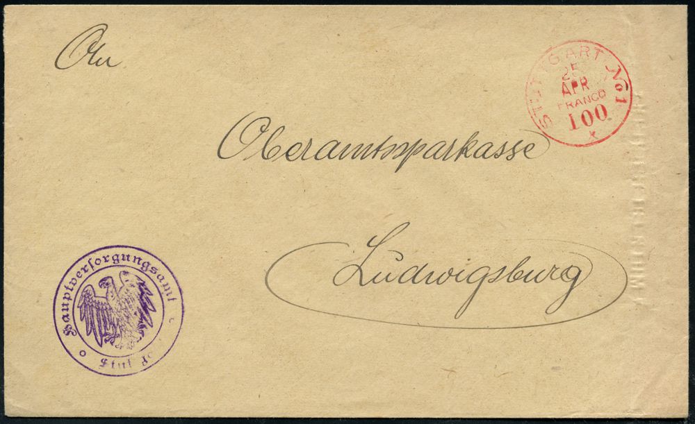 | 1144 | 20 € | WEIMARER REPUBLIK 1919 - 1932/33 : STUTTGART No 1/ FRANCO/ 100 1923 (25.4.) 1K-PFS 100 (Mark) auf Dienst-Bf.: Landesversorgungsamt.. n. Ludwigsburg (Dü.A-3, Nr.8, 100 Mark) | | |
