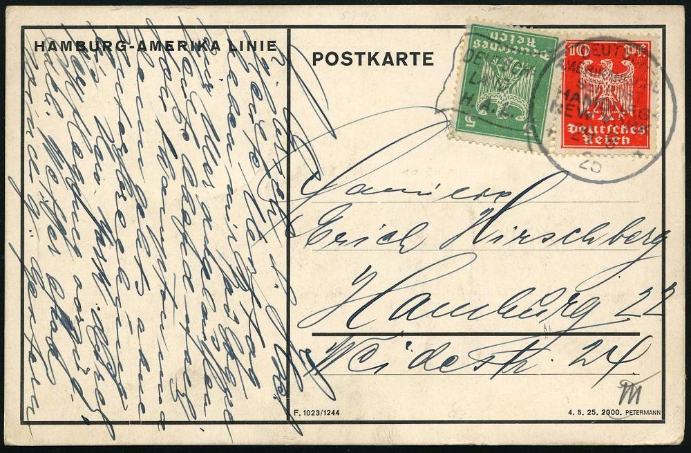 | 1155 | 35 € | WEIMARER REPUBLIK 1919 - 1932/33 : DEUTSCHES REICH 1925 (29.8.) 1K-Fahnen-BPA: DEUTSCH-/AMERIKANISCHE/SEEPOST/HAMBURG-/NEW YORK/**/DEUTSCH-/LAND/H.A.L. glasklar auf zweifarbiger Hapag-Schiffs-Ak: D. "Deutschland" n. Hamburg (Mi.356/57) | | |