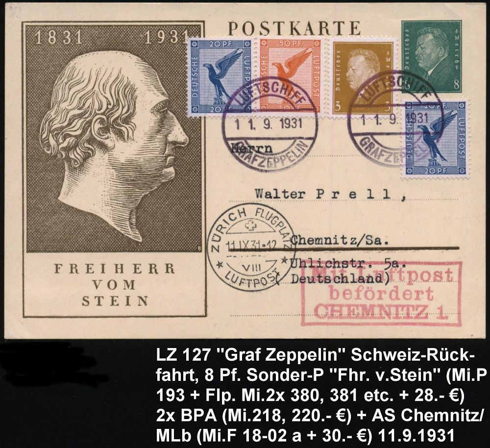 | 1160 | 100 € | WEIMARER REPUBLIK 1919 - 1932/33 : DEUTSCHES REICH 1931 (11.9.) Zürichfahrt LZ 127, 2x viol. Bordpost-1K: LUFTSCHIFF/GRAF ZEPPELIN auf Sonder-P 8 Pf. Freih. v. Stein (Mi.P 193 + Mi.380 (2), 381 etc.,+ 25.-EUR) Abwurf Zürich (1K: ZÜRICH FLUGPLATZ) + roter Ra3: ML/b/CHEMNITZ 1. (Mi.F-18-02a,+ 15.-EUR) LZ 127 wurde nach Aufhebung des Zeppelin-Bauverbots durch den Versailler Vertrag 1925 als 1. Zeppelin gebaut (Mi.218 + 220,- EUR) | | |