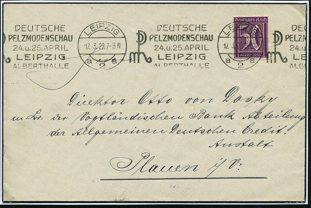 | 1110 | 18 € | WEIMARER REPUBLIK 1919 - 1932/33 : LEIPZIG/ a2a/ DEUTSCHE/ PELZMODENSCHAU/ 24.u.25.APRIL/ ..ALBERTHALLE 1922 (17.3.) Band-MWSt klar auf dekorativem Infla-Trauer-Bf. an Otto von Dosky, Plauen (Bo.45 Bd) | | |