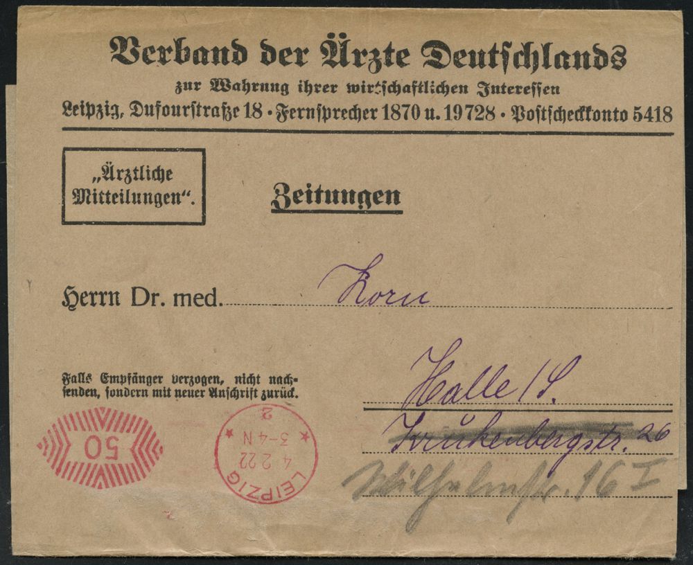 | 1111 | 18 € | WEIMARER REPUBLIK 1919 - 1932/33 : LEIPZIG/ * 2 * 1922 (4.2.) roter Ziermuster-PFS 50 (Pf.) auf Zeitungs-Streifband: Verband der Ärzte Deutschlands zur Wahrung ihrer wirtschaftlichen Jnteresse.. + "Ärztliche Mitteilungen" (Dü.D-1, Nr.11) | | |