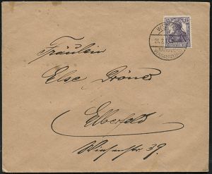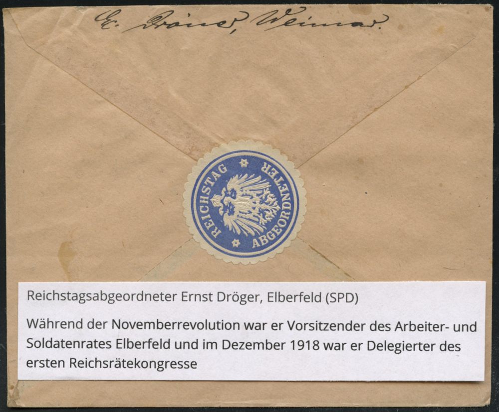 | 1148 | 65 € | WEIMARER REPUBLIK 1919 - 1932/33 : WEIMAR/ c/ NATIONAL-/ VERSAMMLUNG 1919 (21.2.) SSt mit UB "c" = Hauspostamt Parlament auf EF 15 Pf. Germania, rs. blaue Präge-Siegeloblate: REICHSTAG ABGEORDNETER noch mit altem Kaiserl. Adler + rs. eigenhändiger Abs.: "E.(rnst) Dröger" = Reichstagsabgeordneter, während der Novemberrevolution Vorsitzender des Arbeiter u. Soldatenrates Elberfeld, im Dez. 1918 war er Delegierter des 1. Reichsräte-Kongresses, Fern-Bf. (n. Elberfeld) | | |