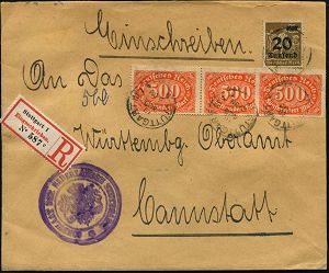 | 1145 | 18 € | WEIMARER REPUBLIK 1919 - 1932/33 : STUTTGART Nr.1/ h* 1923 (30.8.) alter 1K + RZ: Stuttgart 1 (gez.RZ, "R" rechts) + viol. HdN: CONSULAAT DER NEDERLANDE (Wappen) diplomatischer Orts-R-Bf. (rs. etw.fleckig) 2 Lacksiegel! (Mi.251 (3), 281) | | |