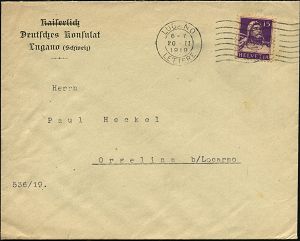 | 1166 | 16 € | WEIMARER REPUBLIK 1919 - 1932/33 : SCHWEIZ 1919 (20.2.) aptierter Dienst-Bf.: "Kaiserliches Deutches Konsulat/ Lugano.." ("Kaiserlich" gestrichen) MaWellenSt.: LUGANO, früher Inl.-Dienstbf. der Weimarer Republik!, rs. AS. (Mi.120 EF) | | |