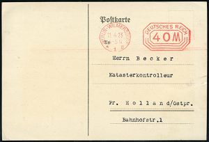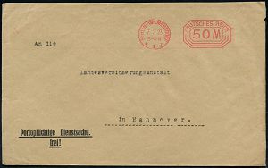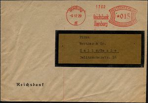 | 1099 | 20 € | WEIMARER REPUBLIK 1919 - 1932/33 : HAMBURG/ 11/ Reichsbank/ Hamburg 1929 (5.12.) AFS Francotyp "Bogenrechteck" aus dem Jahr der Weltwirtschaftskrise , Reichsbank-Dienst-Bf. (Dü.E-1Ah) | | |