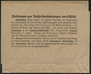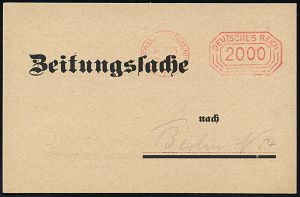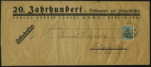| 1017 | 18 € | WEIMARER REPUBLIK 1919 - 1932/33 : BERLIN SW/ g68g 1919 (27.10.) 1K-Brücke auf EF 5 Pf. Germania m. Firmenlochung "B. L. A." auf Zeitungs-Streifband: "20. Jahrhundert" Dokumente zur Zeitgeschichte, VERLAG A. SCHERL = extrem rechts-konservativer u. anti-demokratischer Verlag im Besitz von A. Hugenberg (1865 - 1951), "Harzburger Front", Hitler-Sympatisant (Mi.85 II EF, Perfin) | | |