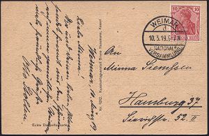 | 1149 | 18 € | WEIMARER REPUBLIK 1919 - 1932/33 : WEIMAR/ d/ NATIONAL=/ VERSAMMLUNG 1919 (10.3.) SSt mit UB "d" = Hauspostamt Parlament , klar gest. Bedarfs-Ak. (die Altenburg) + Faksimile-Foto Nationalversammlung 9.-10.3. = Landtagswahlen in Deuschland! (Bo.2 d) | | |