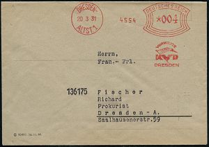 | 1079 | 30 € | WEIMARER REPUBLIK 1919 - 1932/33 : DRESDEN-/ ALTST.1/ VORWÄRTS/ K V D/ DRESDEN 1931 (20.3.) seltener AFS Francotyp "Bogenrechteck" = K(onsum)-V(erein) Dresden, Motiv: Rote Fahne , rs. gl. Motiv als Abs.-Vordruck, seltener Orts-Bf. (Dü.E-1Am) | | |