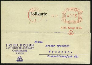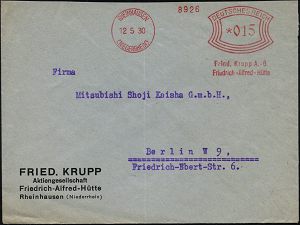 | 1137 | 20 € | WEIMARER REPUBLIK 1919 - 1932/33 : RHEINHAUSEN/ (NIEDERRHEIN)/ Fried.Krupp A-G/ Friedrich-Alfred-Hütte 1930 (12.5.) AFS Francotyp "Bogenrechteck" , klar gest. Firmen-Bf. (schwache Mittelfalte) an Fa. Mitsubishi!, Krupp arbeitete in der Weimarer Republik heimlich an der Entwicklung von Panzern (dazu Fotokopie) etc., (Dü.E-1Ah) | | |