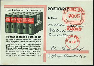 | 1047 | 25 € | WEIMARER REPUBLIK 1919 - 1932/33 : BERLIN.SW 19/ RM Code 1928 (19.6.) AFS-Vorläufer Vertikal-Typ "Bafra": Achteckwertrahmen 0005 Pf. (vierstellige Wert-angabe) Color-Reklame-Kt.: Deutsches Reichs-Adressbuch, rs. roter Abs.: Rudolf Mosse, Abt. Adressbücher u. Codes = jüdischer Verlag, von den Nazis "arisiert"! (Dü.E-VII/ Nr.28 c) | | |