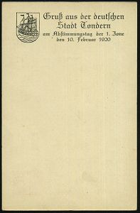 | 1162 | 30 € | WEIMARER REPUBLIK 1919 - 1932/33 : SCHLESWIG ABSTIMMUNG 1920 PP 15 Pf. "Plebiscit", lila: Gruß aus der deutschen Stadt Tondern am Abstimmungstag der 1. Zone/den 10. Febr. 1920 (Stadtwappen = histor. Segelschiff) ungebr., selten! (Urkarte P 3) | | |