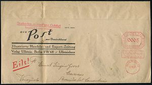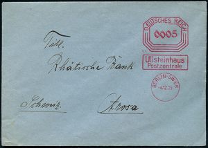 | 1035 | 28 € | WEIMARER REPUBLIK 1919 - 1932/33 : BERLIN SW 68/ Ullsteinhaus/ Postzentrale 1925 (4.12.) seltener AFS-Vorläufer "Bafra" mit Vertikalachse, vierstellig! , rs. Abs.-Vordruck: VERLAG ULLSTEIN.. = jüdischer Verlag, nach 1933 "arisiert" (Logo: Eule), Ausl.-Bf. (Dü.E-VIII, Nr.35 g) | | |