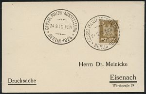 | 1040 | 18 € | WEIMARER REPUBLIK 1919 - 1932/33 : BERLIN 1926/ GROSSE POLIZEI-AUSSTELLUNG 1926 (24.9.) seltener SSt (2 Tilden) 2x klar auf Inl.-Karte (Bo.90) | | |