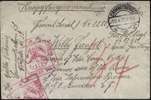 | 1068 | 25 € | WEIMARER REPUBLIK 1919 - 1932/33 : CRIMMITSCHAU/ **f 1919 (20.4.) 1K-Brücke + viol. US-Zensur-Ra.: PASSED BY/BASE CENSOR/*20* (US-Adler m.Sternen, Wo. unbekannt!) portofreier Kgf.-Bf. an Lager Nr. 34 in Frankreich eines deutschen Kriegsgef., seltener Nachkriegs-Beleg! | | |