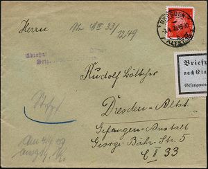 | 1074 | 40 € | WEIMARER REPUBLIK 1919 - 1932/33 : DRESDEN-/ b/ ALTST.16 1929 (3.4.) 1K-Brücke auf EF 10 Pf. Ebert, rot + sehr seltene Gefängnis-Zensur-Zettel: Briefverschluß/ nach Einsichtnahme/ Gefangenenanstalt Dresden als Eingangs-Zensur, Orts-Zensur-Bf. (Mi.413 EF,+ 18.- EUR) | | |