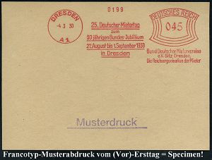 | 1075 | 35 € | WEIMARER REPUBLIK 1919 - 1932/33 : DRESDEN/ A 1/ 25.Deutscher Mietertag/ zum/ 30 jährigem Bundes-Jubiläum/ 27.August bis 1.Sept.1930 / in Dresden/ Bund Deutscher Mietervereine.. 1930 (4.3.) sehr seltener AFS-Musterabdruck Francotyp "Bogenrecht-eck" , glasklar gest. Francotyp-Musterblatt vom (Vor)-Ersttag!, (Dü.E-1CEh, nur kurze Verwendung!) | | |