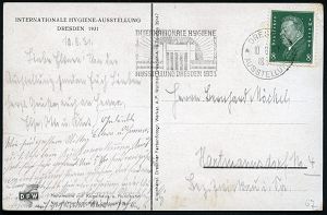 | 1081 | 25 € | WEIMARER REPUBLIK 1919 - 1932/33 : DRESDEN/ *AUSSTELLUNG*/ INT.HYGIEN/ AUSSTELLUNG 1931 1931 (10.8.) MWSt = Sonne hinter Portal des Hygiene-Museums (im Bauhaus-Stil) Color-Ausst.-Sonderkarte: Kugelhaus u. Ausstellungs-Schmalspurbahn, Bedarf! (Bo.67 A) | | |