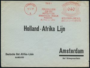 | 1097 | 20 € | WEIMARER REPUBLIK 1919 - 1932/33 : HAMBURG/ 8/ FERIENREISEN/ ZUR SEE/ MITTELMEER/ KANARISCHE INSELN/ MADEIRA/ ..WOERMANN-LINIE AG.. 1929 (12.4.) AFS Francotyp "Bogenrechteck" 040 Pf. auf Firmen-Bf.: Deutsche Ost-Afrika-Linie (kl. Eckmäng.) klar gest. Ausl.-Doppelbf.!, seltenes Porto! (Dü.E-1BAh) | | |