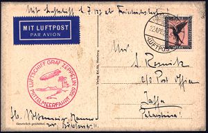 | 1158 | 45 € | WEIMARER REPUBLIK 1919 - 1932/33 : DEUTSCHES REICH 1929 (22.4.) 1K-Brücke: FRIEDRICHSHAFEN/(Bodensee)/* LUFTPOST * auf EF 1 Mk. Adler (Mi.382 EF, + 32.- EUR + viol. Zepp.-HdN: LUFTSCHIFF GRAF ZEPPELIN/MITTELMEERFAHRT 1939 (Zepp./Palmen) Abwurf Sevilla (AS) klar gest. patriot. Kt.: "Treu deutsch.." n. Jaffa!, LZ 127 wurde hauptsächlich durch Spenden finanziert nach der Aufhebung des Zepplin-Bauverbots des Versailler Vertrages 1925 (vergl. Los Nr.1037-39, 1056, 1160) | | |