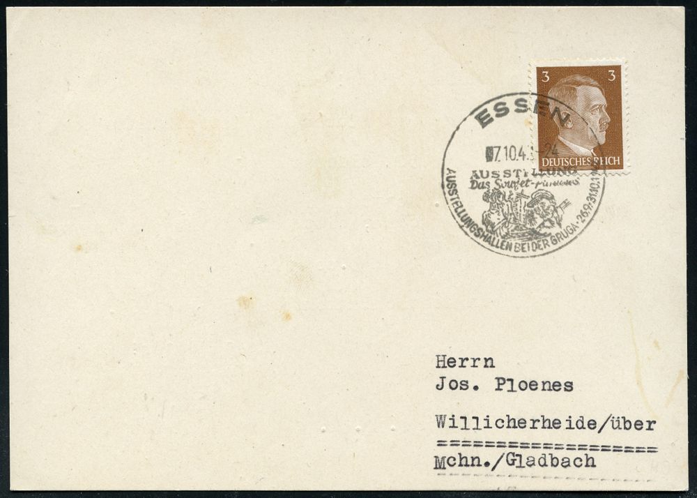 | 1246 | 18 € | DIE DEUTSCH-SOWJETISCHEN BEZIEHUNGEN (1919-1941/42) : BERLIN O 17/ b/ AUSSTELLUNG/ Das Sowjet-Paradies.. 1942 (19.5.) seltener MWSt (Proletenpaar mit Hungerkind) auf PP 3 Pf. Hitler (IPB, PP 152/A 1) klar gest. Orts-Kt., schöne Kombination!, ex Slg. Heyd (Bo.375 A Type IX) | | |