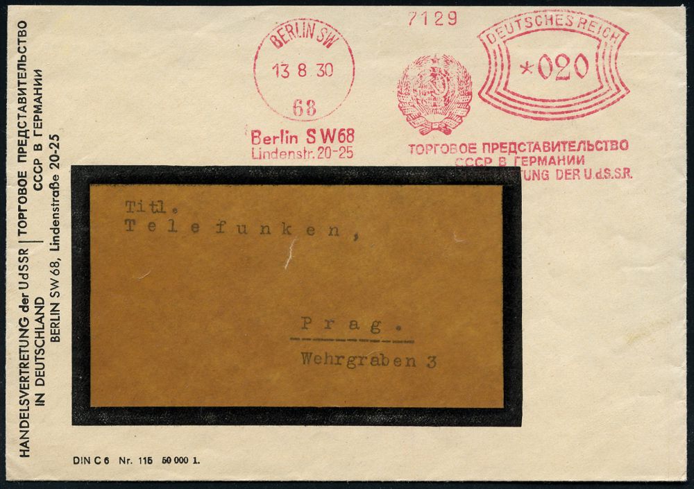 | 1235 | 30 € | DIE DEUTSCH-SOWJETISCHEN BEZIEHUNGEN (1919-1941/42) : BERLIN SW/ 68/ ..HANDELSVERTRETUNG DER U.d.S.S.R. 1930 (13.8.) seltener deutsch-kyrillischer AFS Francotyp "Bogenrechteck" = sowjet. Staatswappen 020 Pf. Sondertarif , kyrill.-deutscher Ausl.-Vordruck-Bf. in die CSR, Sonderporto! (Dü.E-1Ah) | | |