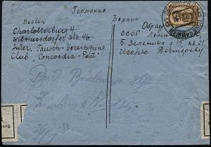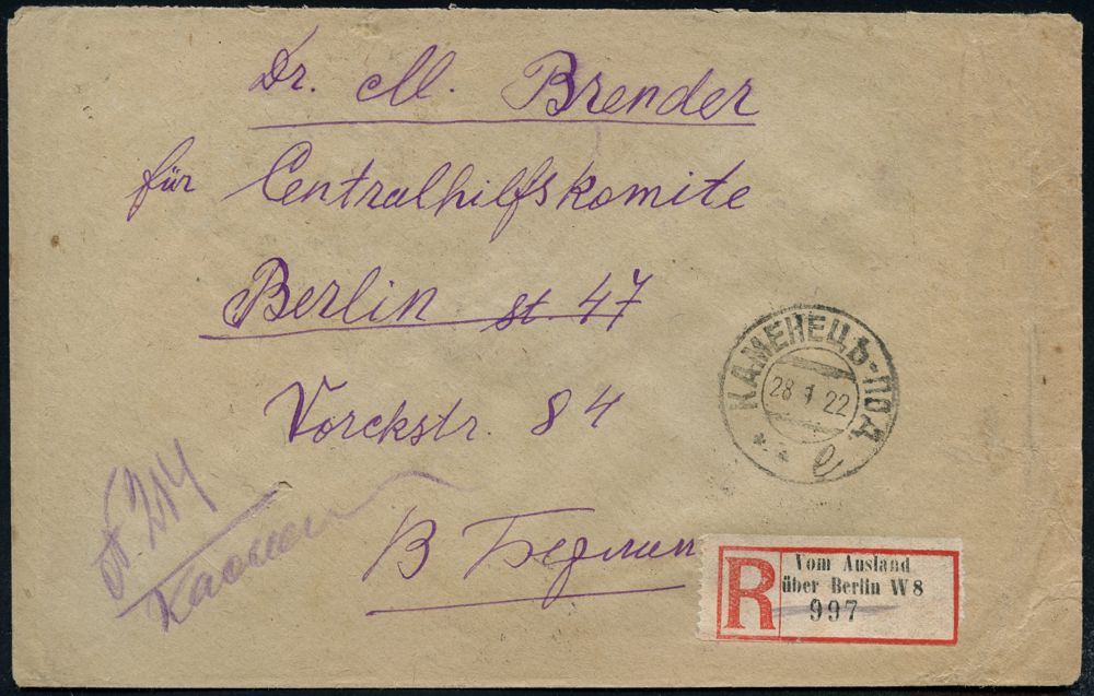 | 1233 | 45 € | DIE DEUTSCH-SOWJETISCHEN BEZIEHUNGEN (1919-1941/42) : Berlin W 8 1922 (28.1.) sowjet. 2K-Steg: KAMENEZ + deutscher RZ: Vom Ausland/über Berlin W 8 (hs. R-Vermerk) an Dr. M. Brender für "Centralhilfskomité" = Hungerhilfe im sowjet. Bürgerkrieg!, seltener Ausl.-Barfrankatur-R-Bf. = auch F.A.O.-Vorläufer! (rs. AS: BERLIN SW/* 47 c) | | |