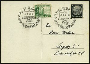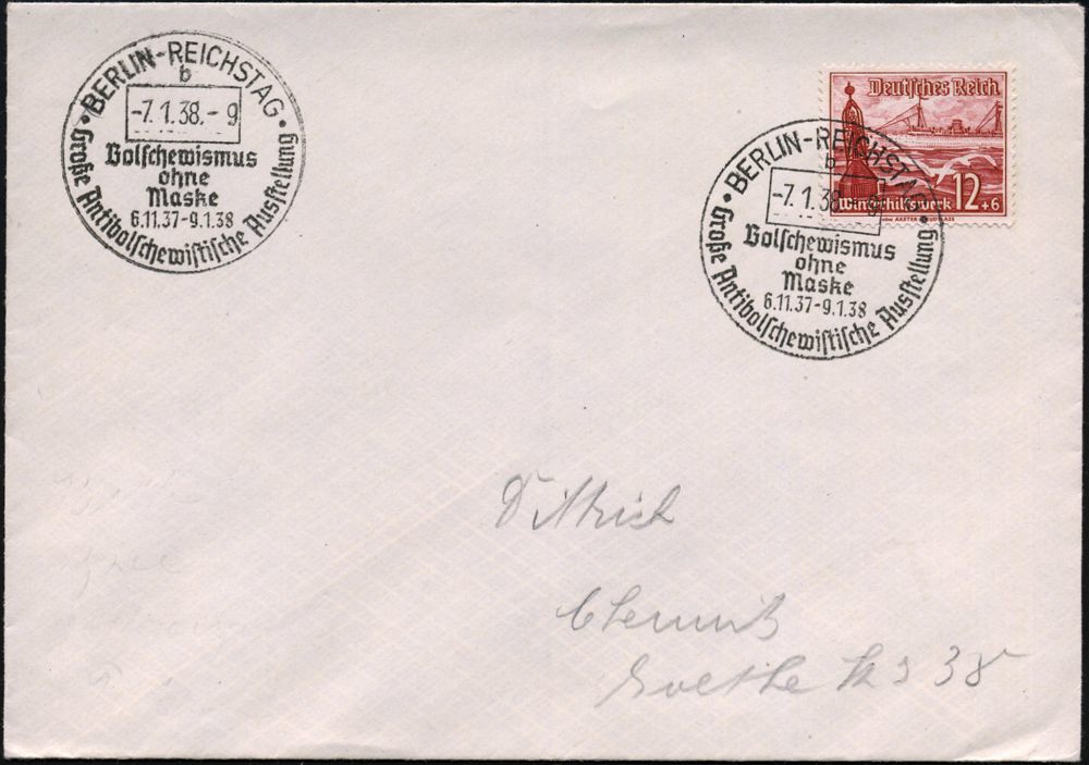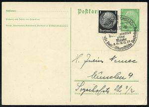| 1238 | 16 € | DIE DEUTSCH-SOWJETISCHEN BEZIEHUNGEN (1919-1941/42) : BERLIN-REICHSTAG/ b/ Bolschwismus/ ohne/ Maske/ Gr.Antibolschewistische Ausstellung 1937 (8.11.) SSt mit UB "b" = Hauspostamt Reichstag , klar gest. Inl.-Karte (Bo.246 b) | | |