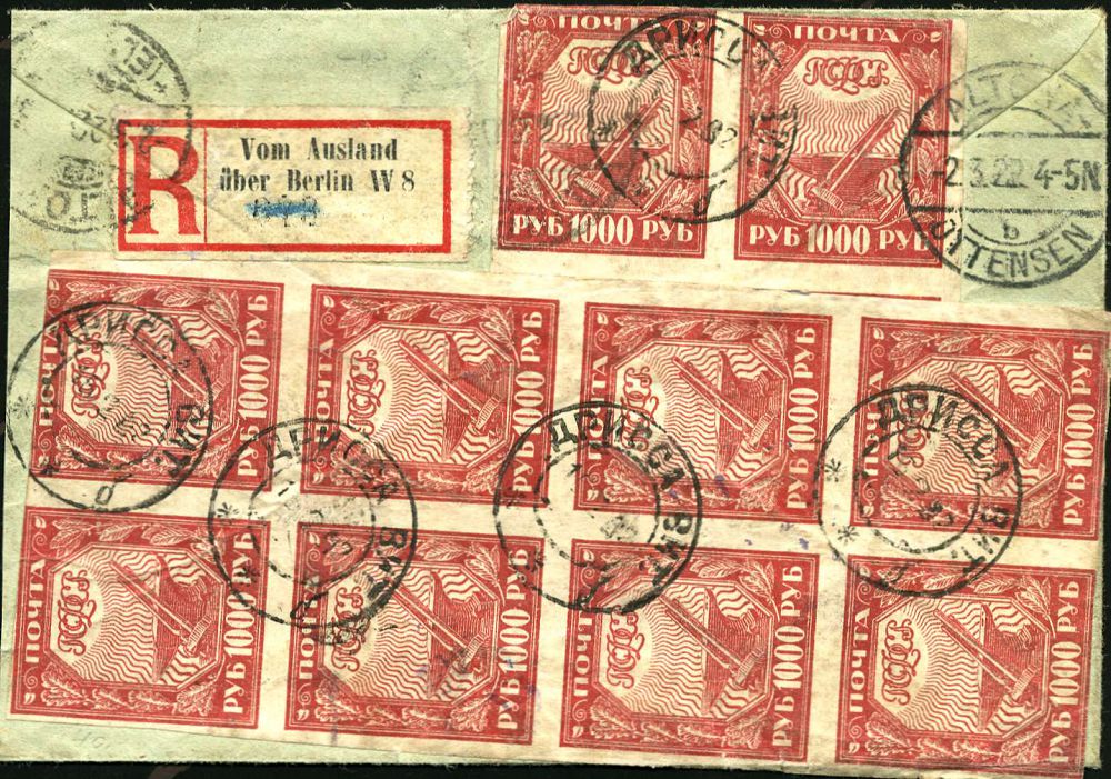 | 1234 | 45 € | DIE DEUTSCH-SOWJETISCHEN BEZIEHUNGEN (1919-1941/42) : Berlin W8 / UdSSR 1922 (2.3.) RZ: Vom Ausland/über Berlin W 8 auf R-Bf. aus der UdSSR (aus DRISSA WIT.) rs. sowjet. Infla-MeF 10x 1000 Rbl. Amboß n. ALTONA-OTTENSEN (AS), vs. R-Vermerk hs., seltener Beleg (Mi.161 MeF) | | |