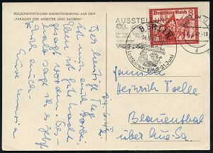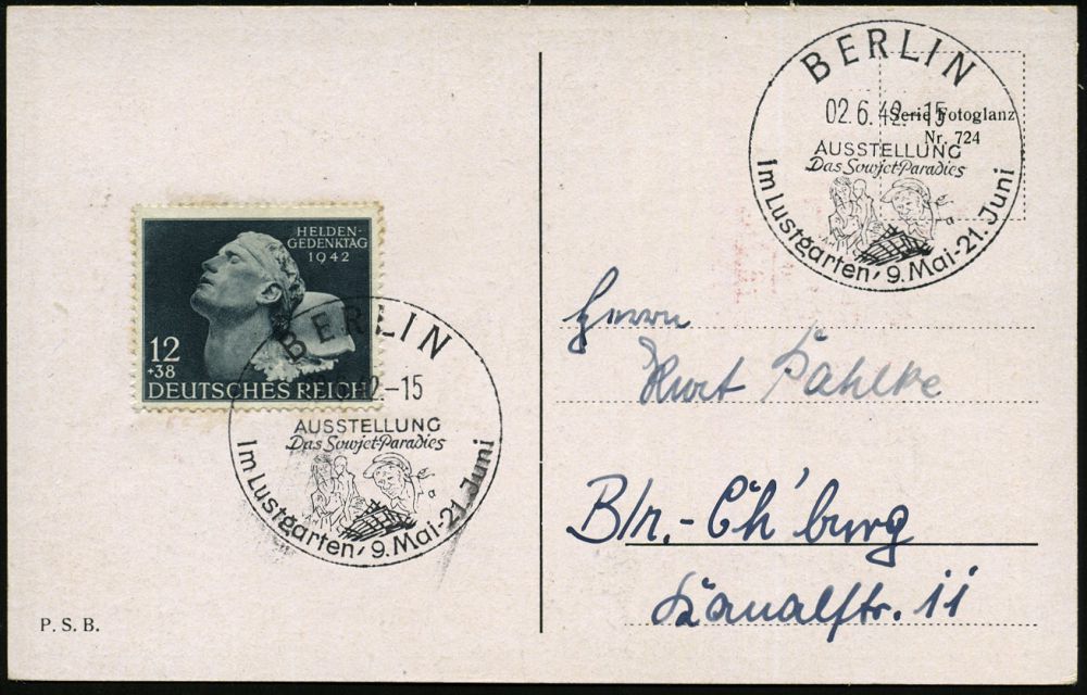 | 1248 | 20 € | DIE DEUTSCH-SOWJETISCHEN BEZIEHUNGEN (1919-1941/42) : BERLIN/ AUSSTELLUNG/ a/ Das Sowjet-Paradies.. 1942 (20.5.) seltener SSt. Type II = Proletarierpaar mit Hungerkind , klar gest. Bedarfs-Kt. mit viel Text (Bo.376 a ,Ty.II = "a" gerade!) | | |