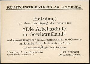 | 1251 | 25 € | DIE DEUTSCH-SOWJETISCHEN BEZIEHUNGEN (1919-1941/42) : Hamburg 1927 (10.5.) 3 Pf. PFS Achteck auf Einladungskarte : "Die Arbeitsschule in Sowjetrußland" (Museum für .Kunst und Gewerbe) seltene Orts-Karte (Dü.D-4) | | |
