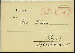 | 1236 | 25 € | DIE DEUTSCH-SOWJETISCHEN BEZIEHUNGEN (1919-1941/42) : BERLIN SW/ 68/ ..HANDELSVERTRETUNG DER U.d.S.S.R. 1930 (23.9.) seltener, deutsch-kyrillischer AFS Francotyp + RZ: Berlin 66 / a a (UdSSR-Staatswappen) klar gest. Inl.-R-Vorderseite (Dü.E-1Ah) | | |