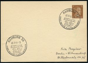 | 1252 | 18 € | DIE DEUTSCH-SOWJETISCHEN BEZIEHUNGEN (1919-1941/42) : HAMBURG 36/ AUSSTELLUNG/ Das Sowjet-Paradies/ ..PLANTEN UN BLOMEN 1942 (3.8.) SSt = Proletarierpaar mit Hunger-Kind auf PP 3 Pf. Hitler, braun (blanco, Mi.PP 152/A 1) klar gest. Inl.-Karte (Bo.118) | | |