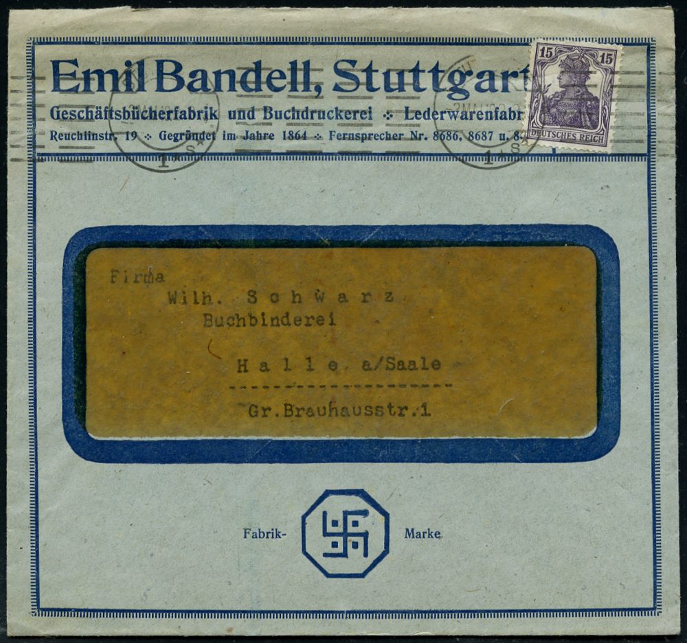 | 1263 | 30 € | NS-VORLÄUFER : Stuttgart 1 1921 (2.5.) Firmen-Bf.: Emil Bandell mit Ha k e n k r e u z als Firmenlogo! (Geschäftsbücher-Fabrik) seltener Infla-Inl.-Bf. (Mi.100 EF) | | |