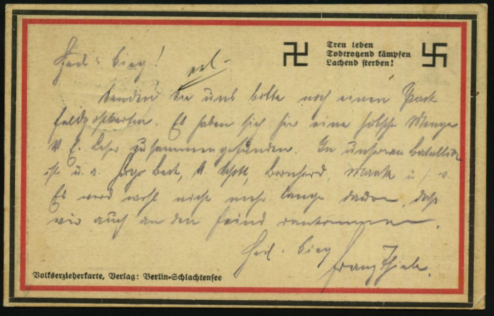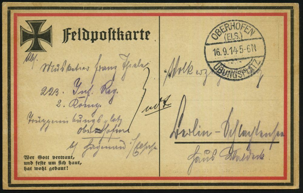| 1262 | 30 € | NS-VORLÄUFER : OBERHOFEN/ (ELS:)/ ÜBUNGSPLATZ 1914 (26.11.) 1K-Brücke = Hauspostamt Truppenübungsplatz auf patriotischer Propaganda-Ak.: Treu leben, Todtrotzend kämpfen, Lachend sterben! mit zwei H a k e n k r e u z e n ! , glasklar gest. Feldpost-Kt. n. Berlin (Volkserziehungskarten-Verlag, Bln-Schlachtensee) | | |