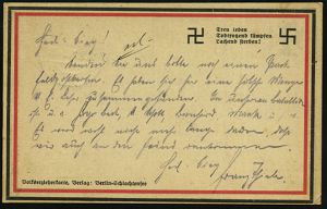 | 1259 | 25 € | NS-VORLÄUFER : Korbach 1921 (6.10.) 1K-Gitter: CORBACH/* a * auf Vordr.-Bf.: Jungdeutscher Orden "Das Vaterland über die Partei!", Bruderschaft Corbach (Malteser Kreuz) gegr. 1920, im selben Jahr an der Niederschlagung des Ruhr-Aufstandes beteiligt, anti-semitische, anti-bolschwistische Organisation, dennoch 1933 von Nazis verboten, berühmtes Mitglied Harro Schulze-Boysen ("Rote Kapelle"), seltener Fern-Bf. (Mi.147) | | |