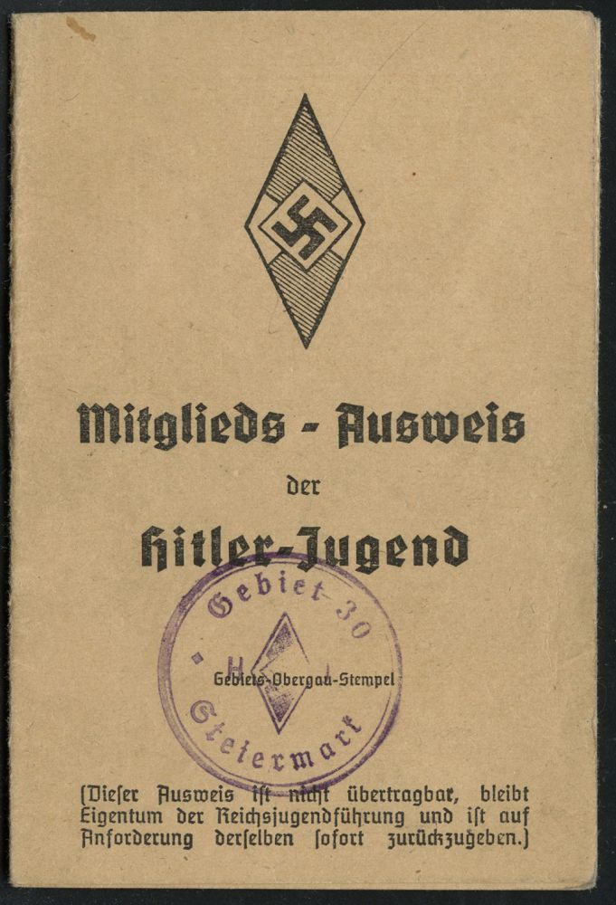 | 1529 | 40 € | HITLERJUGEND & BUND DEUTSCHER MÄDEL : Fehring 1939 (15.2.) orig. Mitglieds-Ausweis der Hitler-Jugend (Klappkarte ohne Lichtbild) vs. Dienst-2K-HdN: Gebiet 30/H J/Steiermark, seltenes Dokument! (Format 12,2 x 8,2) | | |